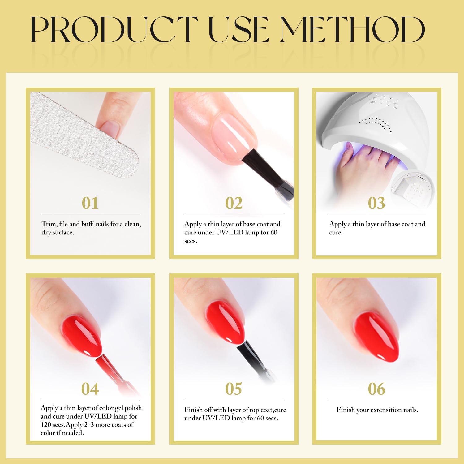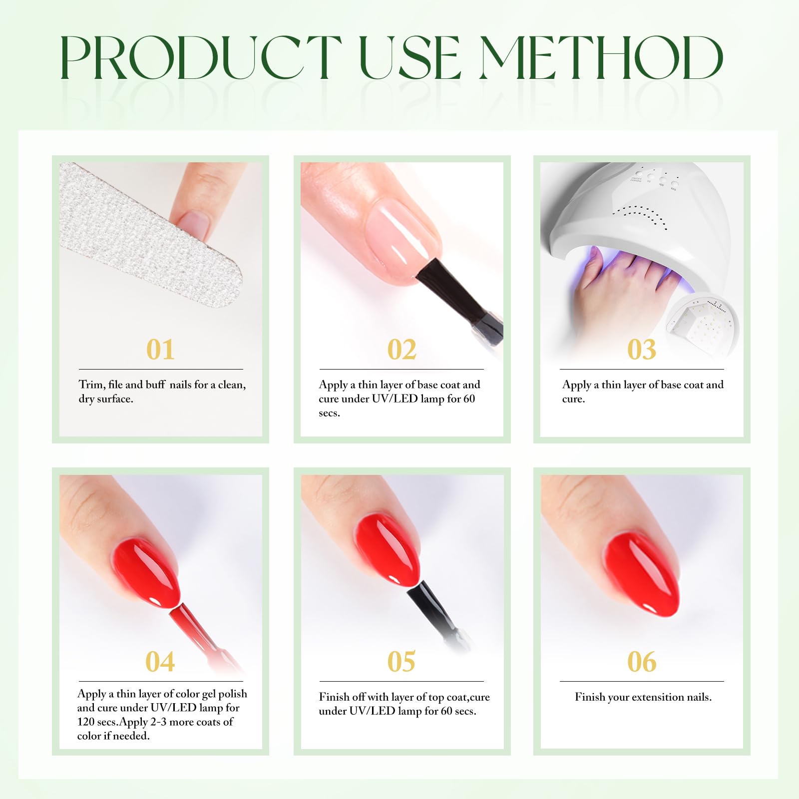 - Same Color Same Bottle GEL POLISH: 1 pc 15ml gel polish for all season, need to be cured under UV or LED Lamp for 60-120s. Must apply with Base Gel and Top Coat. Please shake the bottle or warm it with hot water before use, to acheive a better effect.
